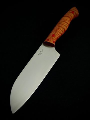 The pinnacle of stainless steel, Swedish Vanax, hugely expensive but it's a 'high end steel' A stunning knife which will be the centre piece of any collection, flat ground with a 15 degree secondary edge and surgical sharp! The handle is fully stabilised Mango wood with red liners and carbon fibre pins.