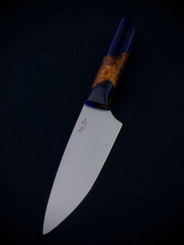 A large chef knife of 10 inches long. Ground from AEB-L stainless to a full flat with a razor sharp edge. Handled in purple dyed, stabilised spalted Beech and finished with G10 ferrules.