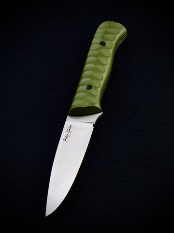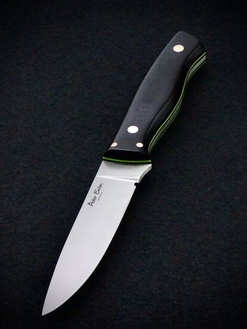 Fortis deer knife in Elmax powder steel. Full flat grind with 18 degrees mirror polished secondary bevel. Handled in black G10 with green G10 liners. Complimented by four pure bronze pins.