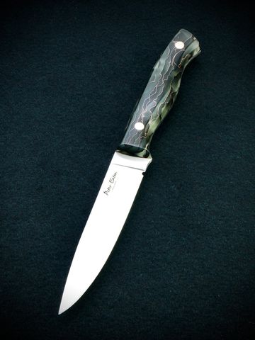Swedish powder steel technology at its finest! A technically advanced steel with a fully stabilised burl Elm handle that has been cast in translucent blue resin. Combined with blue liners and black carbon fibre handle pins it really is a 'pretty petty' A full flat grind with a 15 degree edge, scary sharp with a performance to match!
