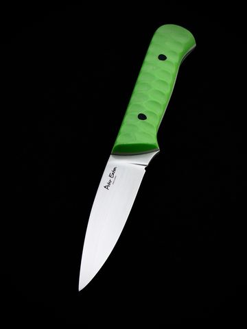 Fortis deer knife in Elmax powder steel. Full flat grind with 18 degrees mirror polished secondary bevel, complete with a tapered tang .Handled in toxic green G10 with grey green G10 liners.